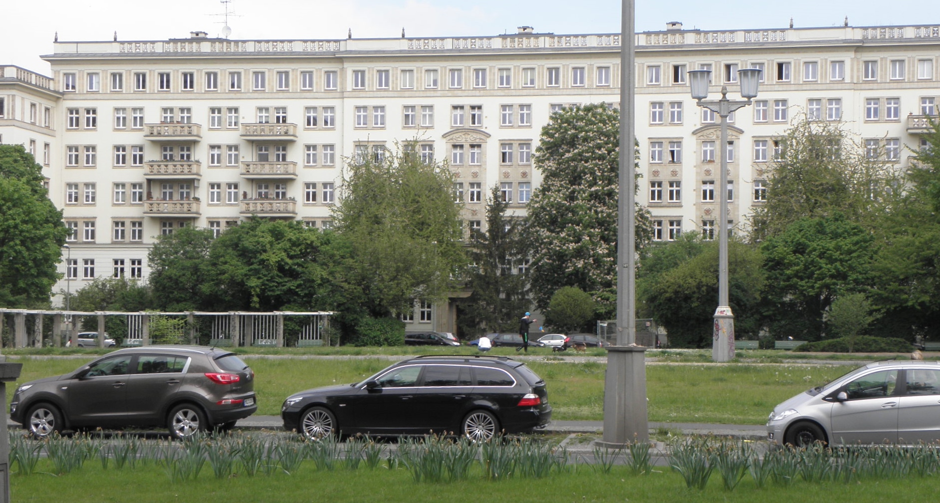 Un peu d’histoire : la Stalinallee – qui depuis 1961 s’appelle Karl-Marx-Allee et a retrouvé son nom originel de Frankfurter Allee à partir de la station de métro Frankfurter Tor, – a été conçue au lendemain de la guerre comme l’avenue prestigieuse de la nouvelle capitale communiste Berlin-est. «La Stalinallee est l’artère la plus importante à l’est de la ville pour les manifestations ou rassemblements et pour les marches traditionnelles vers les tombes des grands socialistes enterrés au cimetière central de Friedrichsfelde. » précise le concours d’architecture pour la Stalinallee de 1951. Différentes options sont débattues mais finalement le culte de la personnalité de Staline battant son plein, les architectes de l’époque sont conviés à Moscou. Les idées de l’architecte Hans Scharoun – qui voulait faire des « cellules d’habitats avec petits jardins » sont abandonnées. Ils n’en subsistent que quelques-unes, un peu genre cabanes à lapin, il faut le reconnaitre. Les visions de Walter Ulbricht, premier secrétaire du Parti communiste de RDA et de Joseph Staline – seront appliquées.