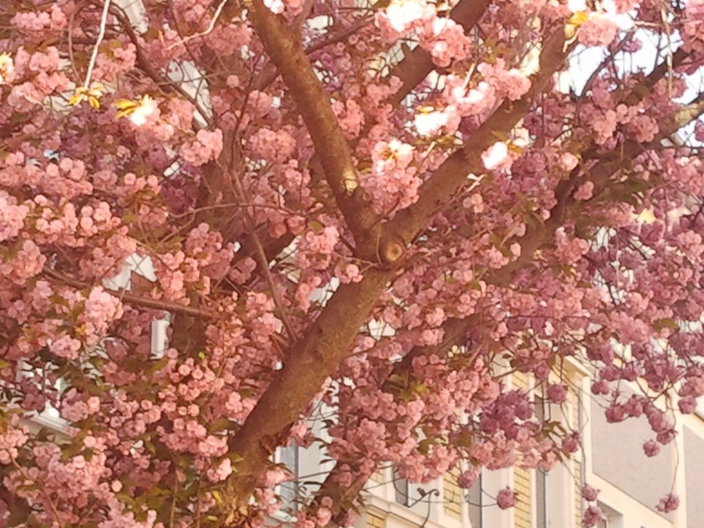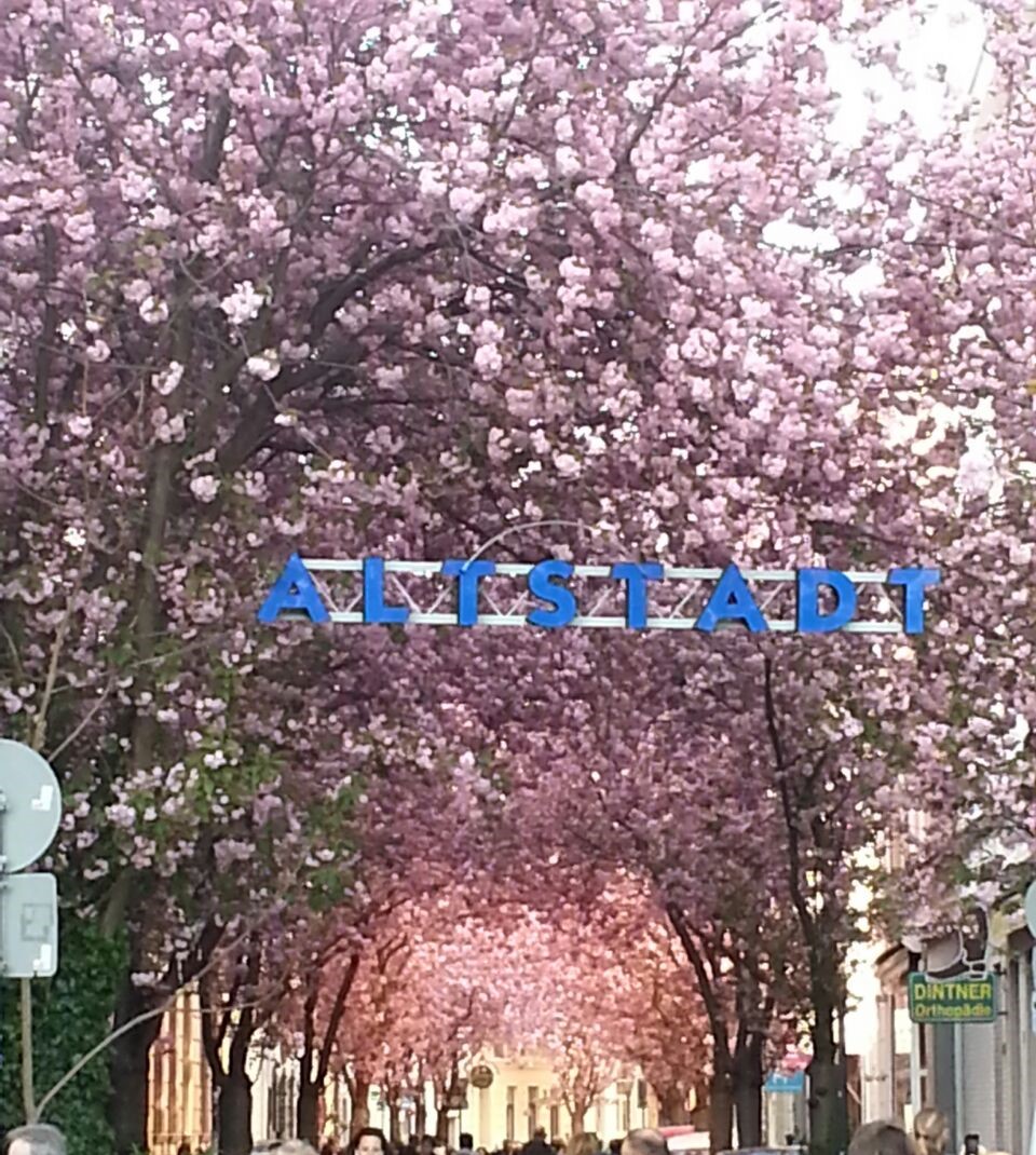 C’est en 1986 que les premiers cerisiers japonais (Prunus serrulata) à fleurs « Kanzan », des  fleurs charnues roses, font leur apparition  plantés le long des rues Heerstrasse et Breite Straße. On en compte désormais une soixantaine. Mais depuis, c’est tout le quartier qui s’est converti aux cerisiers japonais : quelques 300 arbres de différentes sortes. Leur durée de vie étant de 30 ans, la municipalité commence à les remplacer ou les tailler. Mais pas question de les supprimer ! Ils sont devenus un véritable phénomène d’attraction avec boutiques de souvenirs et de photos. Japonais, Chinois ou autres touristes asiatiques mais aussi des Allemands et des voyageurs du monde entier se bousculent pendant quelques jours pour « le » selfie devant cette mer de pompons roses. Ce ne sont pas les arbres qui provoquent des nuisances, comme le craignait les habitants il y a quelques décennies, mais bien les humains. La municipalité a dû complètement interdire la circulation et installer des toilettes. Et il faut se battre pour obtenir un peu de place pour une photo sans touristes. Reste à bien calculer sa visite. D’abord pour le démarrage de la saison : cette année, il fait encore un peu froid et les boutons ne sont pas ouverts. Pour se renseigner sur la date de l’éclosion, le blog Cherry blossoms Gemany propose d’envoyer un mail à ceux qui s’inscrivent sur sa page. Une fois les premiers boutons ouverts, il reste encore dix jours à deux semaines pour le fameux selfie avant que les trottoirs et la rue ne se transforment en un tapis rose de fleurs fanées.