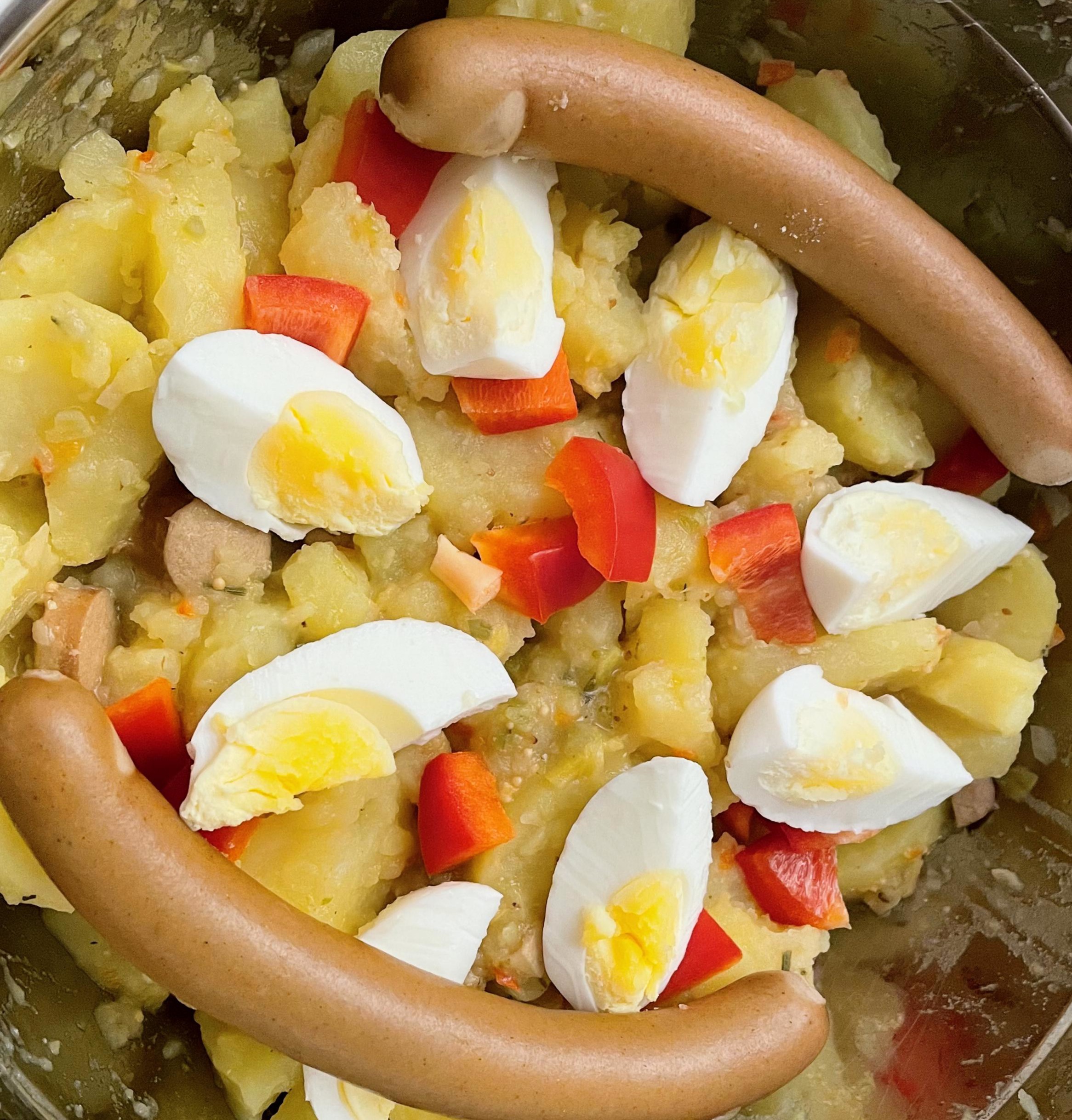 Le marathon ne s’arrête pas le soir de Noël, mais les Allemands avec leur sens pratique se simplifient un peu la vie. On dîne tôt, vers sept heures du soir environ. Et traditionnellement le réveillon se réduit à la plus simple expression : une salade de pommes de terre avec des saucisses de Francfort ! Non, ce n’est pas une blague. Le grand moment, mis en scène d’ailleurs avec clochette pour annoncer aux enfants que tout est prêt, c’est l’ouverture des cadeaux sous le sapin, installés dans le plus grand secret. Mais le lendemain, je vous rassure, se déroule en général à midi un généreux déjeuner en famille. Et le 26, le deuxième jour de Noël, férié aussi, tout le monde se retrouve cette fois dans la famille élargie pour le Kaffee und Kuchen, l’heure du café et des gâteaux, eux aussi bien sûr, fabriqués à la maison, forêt-noire (Schwarzwäler Kirschtorte), tarte au fromage blanc (Käsekuchen), tarte aux noix ou aux fruits, accompagnées de crème fouettée. Inoubliable!