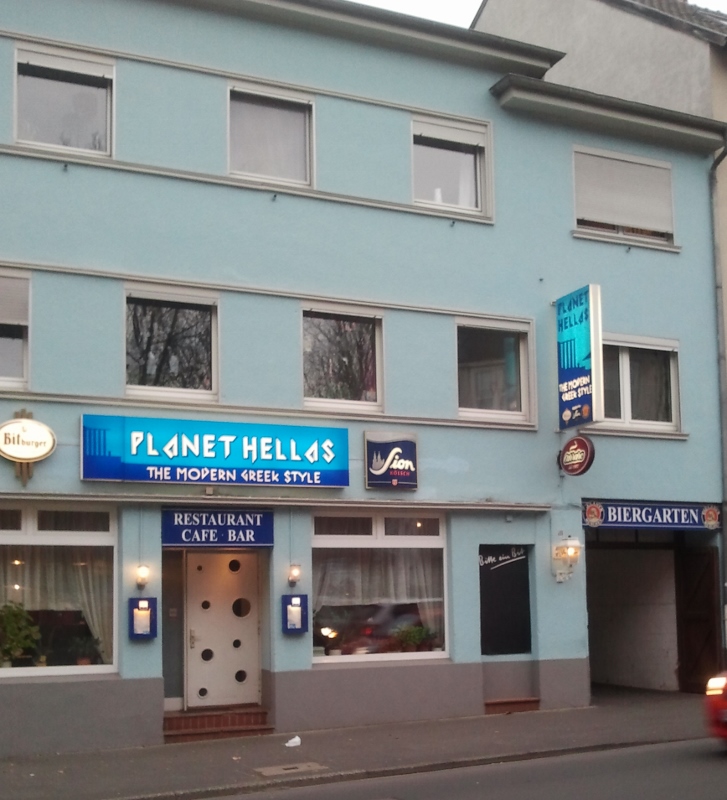 Il a beau s’appeler « planet Hellas – the greek modern style » le restaurant grec de mon quartier avec ses caoutchoucs poussiéreux en vitrine ressemble beaucoup à une gargote allemande des années 50-60. Il ne paye pas de mine, mais il est là depuis toujours. Normal en quelque sorte.
